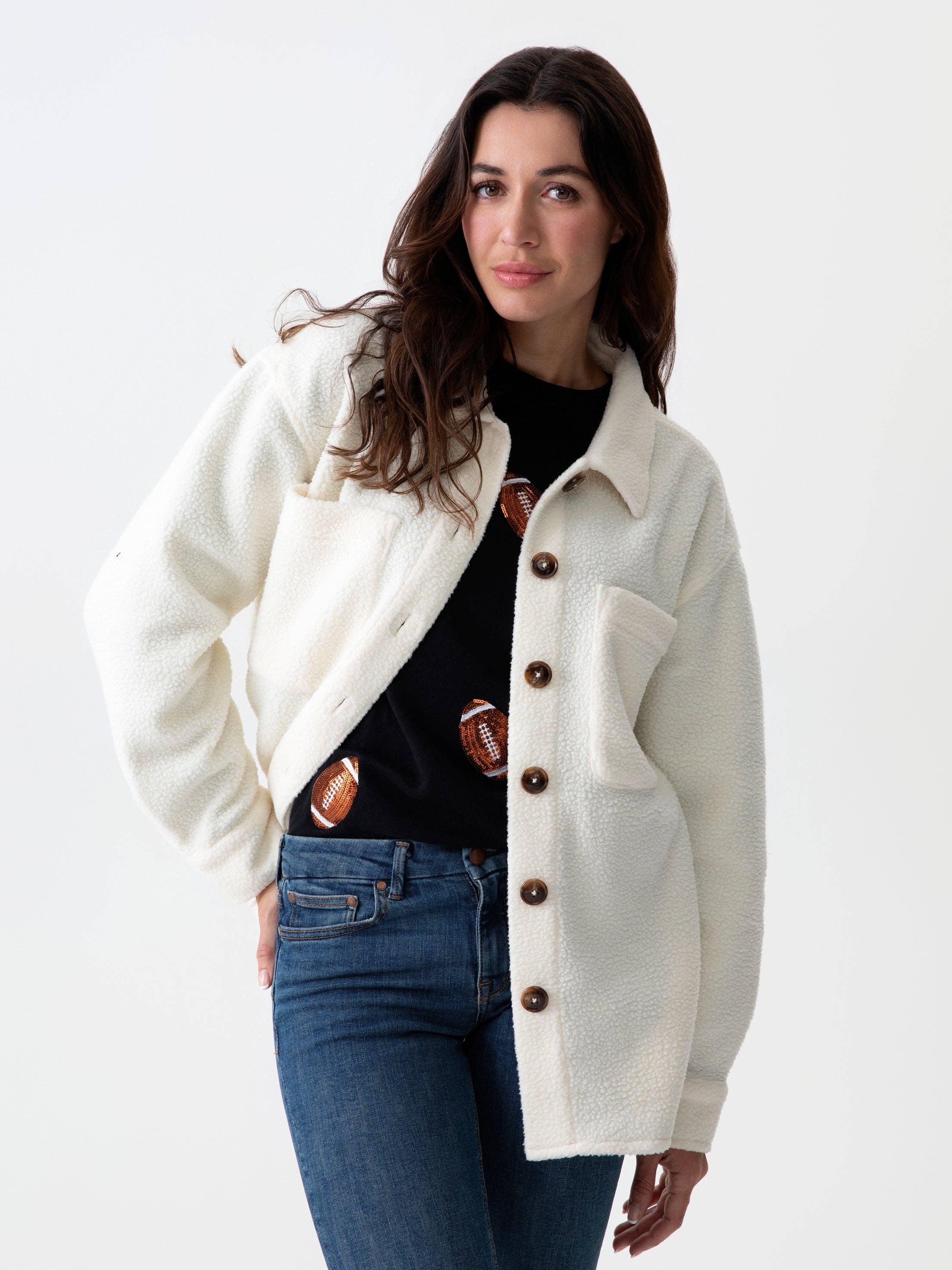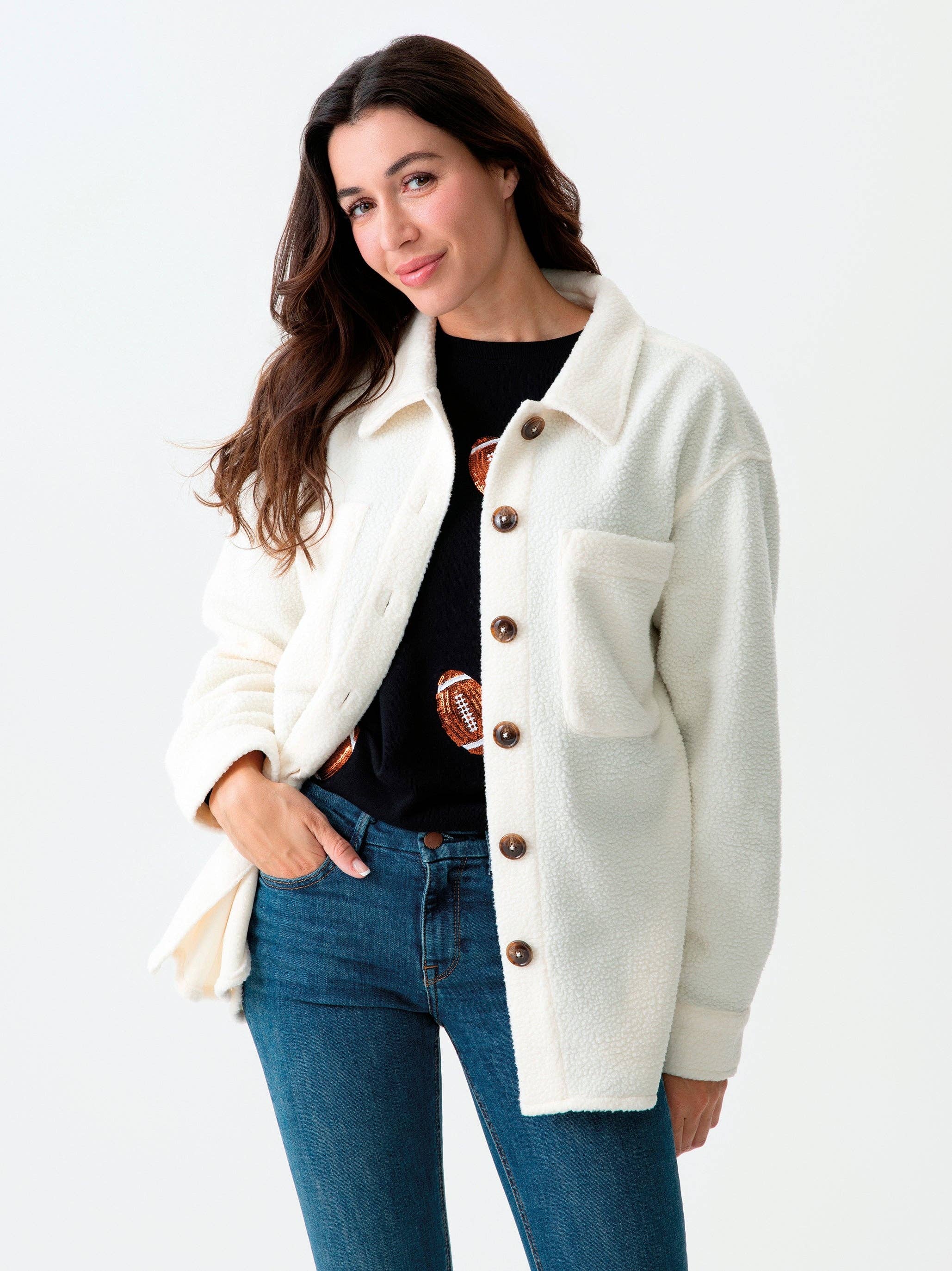 Add another layer to your game day gear with “Get Loud” Sherpa Shacket. Made from chic and soft sherpa material, this lightweight layering piece features brown buttons allowing you to wear it open or closed. The back features the words “Get Loud” in black embroidered lettering surrounding a sporty and sweet football icon. Perfect for any sporting occasion, pair this adorable new apparel piece with other items from the Gameday Collection to complete your theme-driven look!