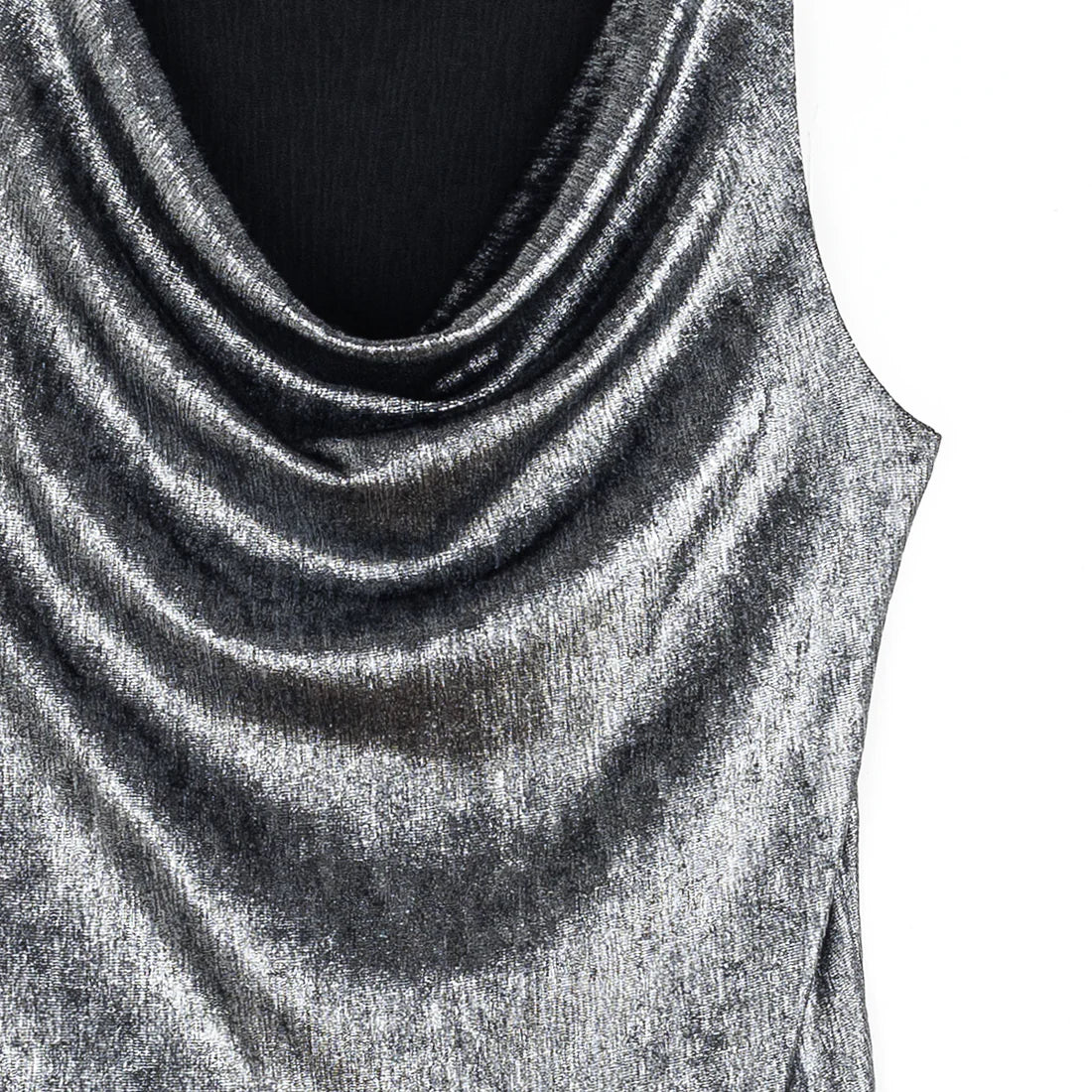 A radiant fabric crafted from a poly-blend, lightweight stretch knit with a gauze-like texture, this fabric offers a sleek metallic shine and effortless drape.