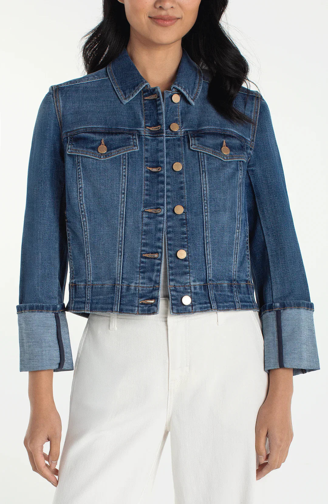 Designed with bracelet-length sleeves and statement high cuffs, this jacket adds an elevated touch to your everyday denim. The structured silhouette, gold hardware, and tailored lines make it easy to dress up or down — whether layered over a blouse for work or paired with a tee and trousers for a polished casual look.