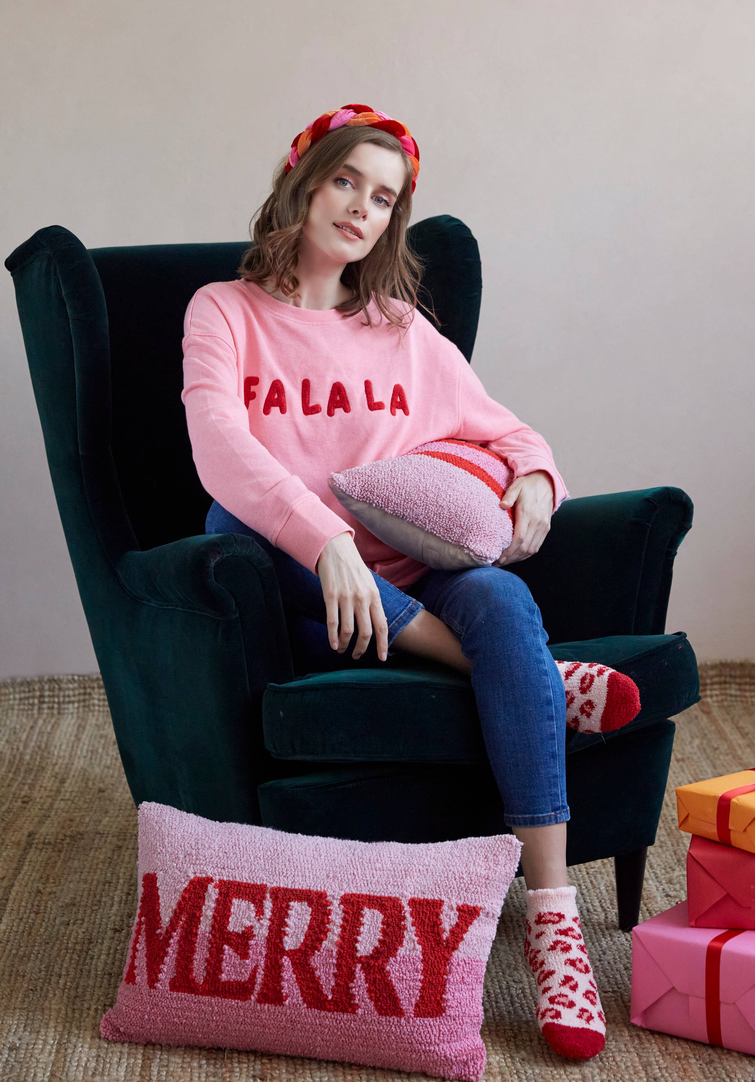 Creatures of comfort, rejoice! Whether you’re working from home or enjoying your Sunday slumber this holiday season, you will appreciate the collection of pieces from Shiraleah that make you feel good. The pink colored "FA LA LA" Sweatshirt is made of lightweight cotton blend and the ultimate lounge piece. It also has red text in bolded sherpa lettering. The classic round neck, banded cuffs and hem allow this sweatshirt to have the perfect fit.