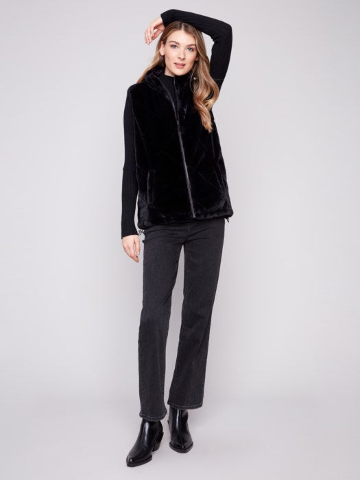 Printed Reversible Quilted Faux Fur Nylon Vest With Welt Pockets
