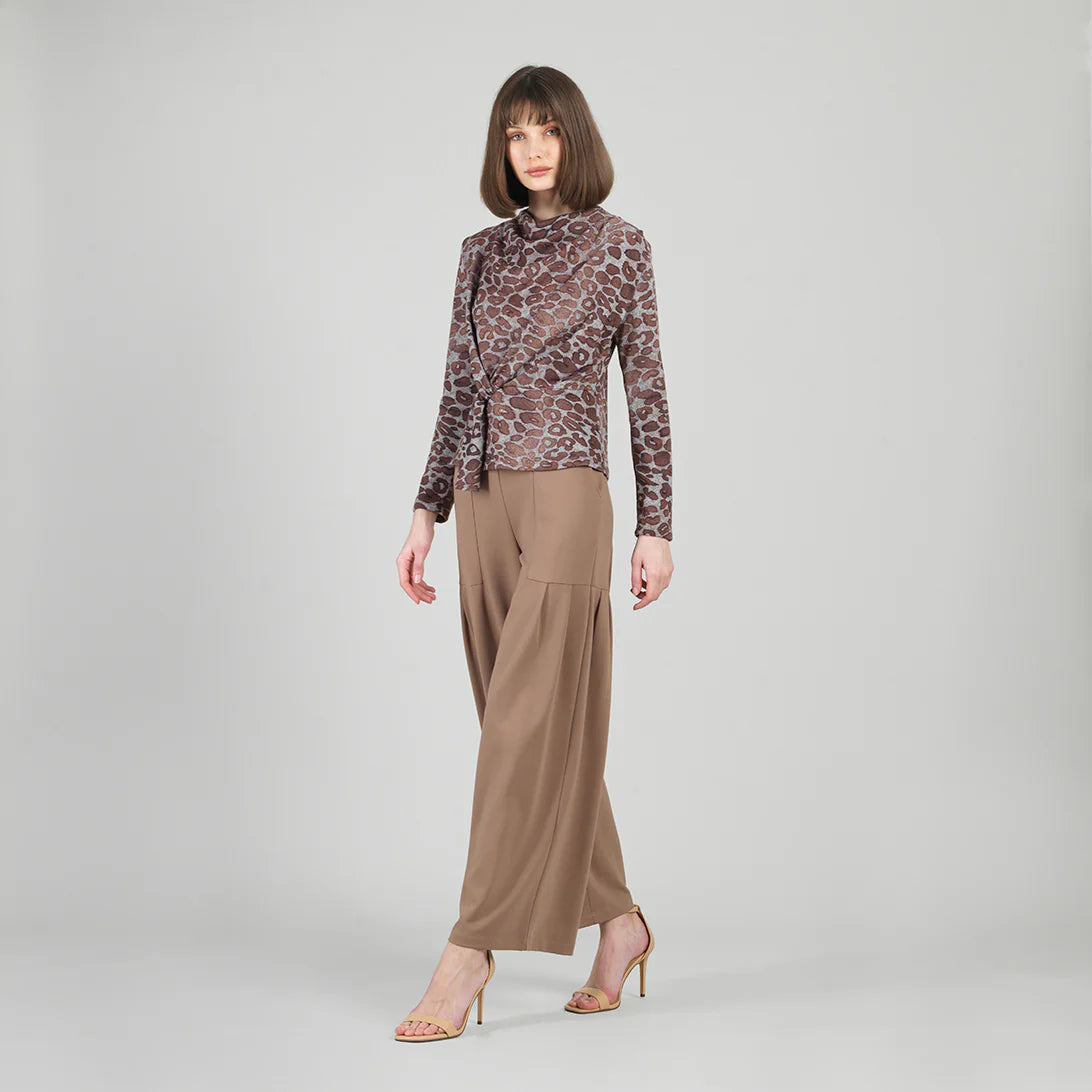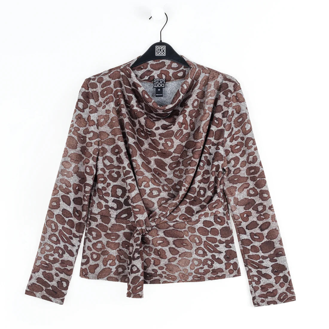 Take a walk on fashion's wild side in our Leopard Motif Long Sleeve Loop Front Sweater Top! An innovative top featuring long sleeves, soft pleat details on the left shoulder, a feminine draped neckline that cascades to display a unique pull-through loop front detail that creates a chic, asymmetrical silhouette with a banded waist and straight hemline.