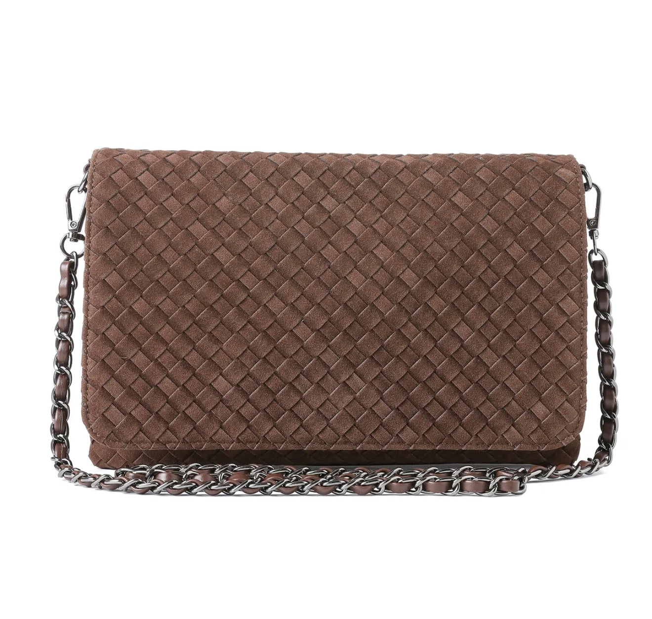 Flap crossbody with 2 accordion segments. Exterior back slip pocket. Interior slip and zip pockets.