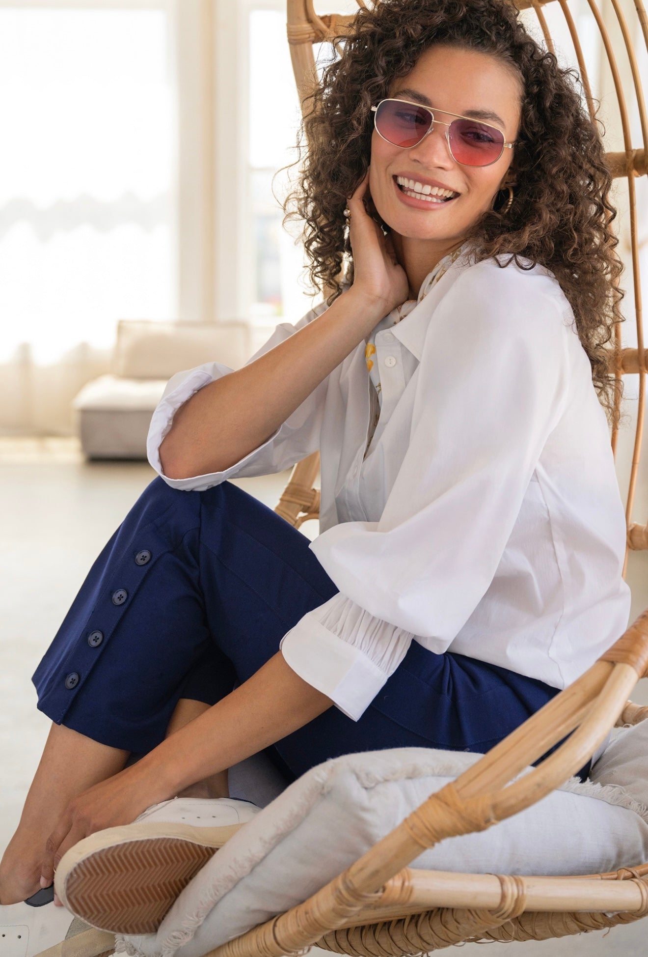 Scrunched sleeves frame this polished shirt crafted from crisp poplin and finished with a curved shirttail hem.
