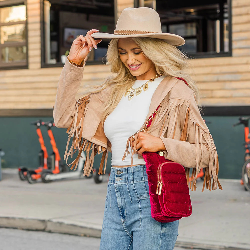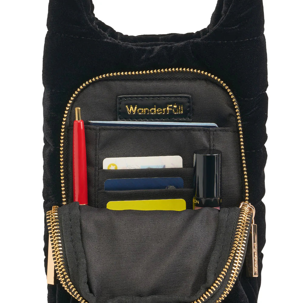 Discover our luxurious velvet holiday collection featuring the Velvet HydroBag® iaccented with a velvet and gold chain strap. This elegant evening bag is designed to stylishly carry your water bottle or favorite wine, ensuring you stay refreshed and chic wherever you go. Don’t compromise on hydration or your favorite drink—make a statement while keeping them close at hand.